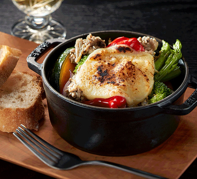 耐熱容器にお好みの具材を詰めて、パテとチーズをトッピング。野菜、どんな具材ともマッチします。