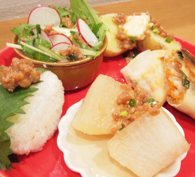 月うさぎの教室は、見て学ぶライブ形式が基本です。手順やポイントの解説を聞きながら、切り方・炒め方などをじっくり観察しましょう。グループ調理のように役割分担がないので、下ごしらえから盛り付けまで、参加したみなさまが等しく学べる点もメリットです。おにぎりの握り方など、実際に手を動かして覚えたほうがよいところがある場合は実践タイムもあります。最後はみんなで試食。見て、聞いて、食べて、五感からレシピを習得していただけます。ご帰宅後、すぐに復習できるよう、写真入りのレシピシートと材料・調味料のお土産付きです。